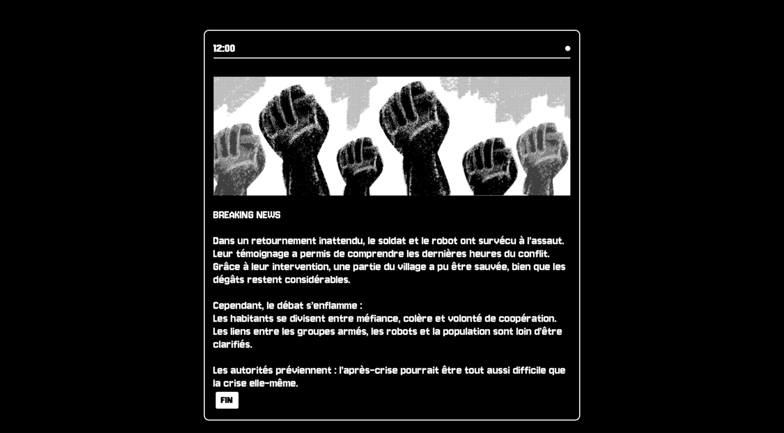 Developed as part of a game design course using Twine, custom CSS, and HTML, ROSA is a French short interactive fiction game exploring the complexities of human-machine coexistence. Set in a dystopian 2044, the narrative immerses players in a post-apocalyptic society torn between hostility toward artificial beings and emerging movements for equality. Taking on the role of an amnesiac protagonist, the player navigates this fractured world through exploration and variable-based choices. The project uses branching digital storytelling to examine social conflicts, prejudice, and the ethical implications of future interactions with humanoid robots inspired by models like iCub and Yushu.
